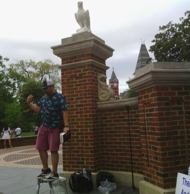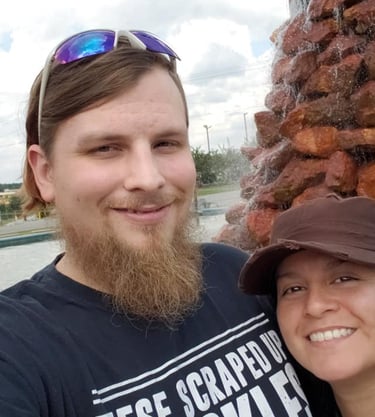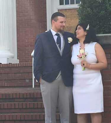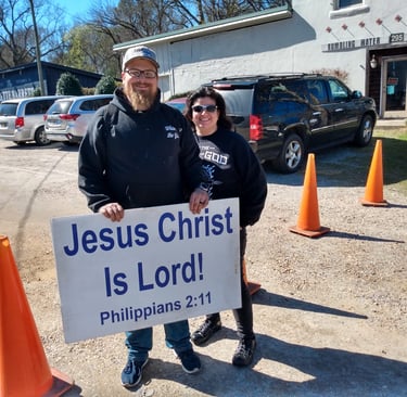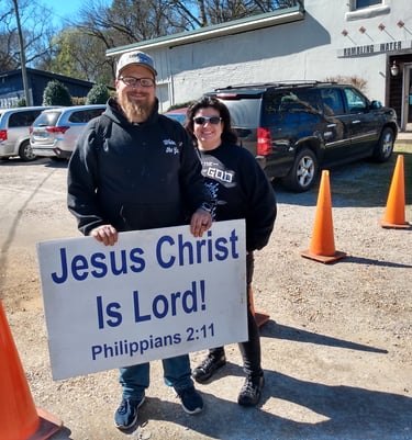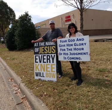 The Lord saved me from myself, and He also provided a wife for me. My wife's name is Liz and she has been by myside through out my life in Christ. She does ministry with me, willing to pray with anyone and loves to hold signs about Christ. Her testimony is like mine, grew up in a broken home. Which lead her down a path of hating authority, also hating any natural order. Though her sins were many, her savior is more. By God's grace and through the preaching of the word, she was saved. She traveled around trying to find the truth in the gospel, unfortunately like a lot of American church's, she only could find preacher's who preach prosperity more than Christ, but God lead her to me, at a mega church. There God led us into a relationship. (we both weren't looking) and eventually moved us down south to Montgomery Alabama. There we found our current Church, and was married. We've been together for several years now. I thank God every day for her. She is currently a stay at home wife, and we have been praying for children. (If God will allow us to have children)