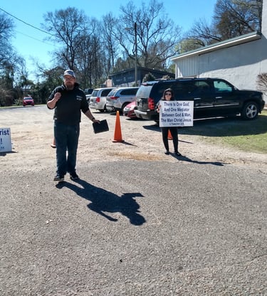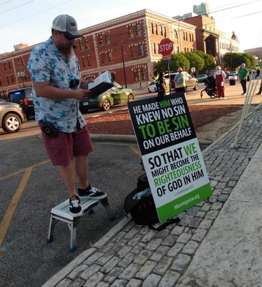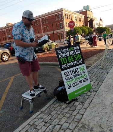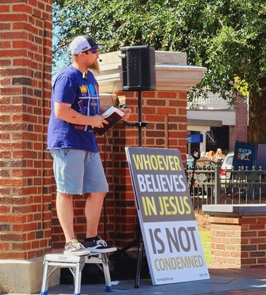 Hello!! My name is Joe, and here is my testimony. I grew up in a nominal Christian home. Church on Sunday and that was the gist of it. My grandparents were faithful in showing Christ to me, but still I went my own path. I started doing things I regret, lived a reckless life. Was in a few relationships which I thought at the time would full-fill me; however, that wasn't the case. My life finally hit rock bottom. Everything I once knew was taken from me. I was alone, hopeless, ran out of options.. But God who is rich in mercy came, and changed my heart. I ran to the bible, and started reading and praying. Lord let this be true, show yourself to me. and the Lord is kind. He showed me my sin, and showed me his kindness. I was born again, I was baptized in a mega church. ( really the only church I knew) And continued to read my bible. God open my eyes to all the bad things about that church and in my life. I finally made the move and God lead us to Montgomery, where God wasn't finish with me yet. A few years later he opened my heart even more, and gave me a desire to preach in the streets, and talk with people. My desire is, (if the Lord will allow), to go full time in the Ministry. Currently I go out maybe twice a week, but I would like the ability to go out more. We go out to the Biscuits game every Friday and Saturday night, (when they are at home of course) and have a prayer and preaching out reach once a month. Sola Deo Gloria